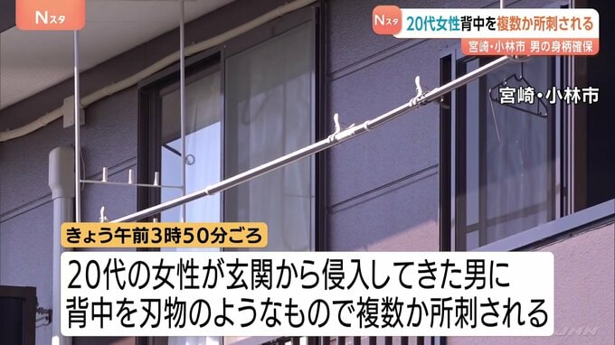 宮崎県小林市のアパートで20代の女性が男に刃物のようなもので背中を刺される殺人未遂事件が発生し、警察は男の身柄を宮崎県内で確保しました。容疑が固まり次第、逮捕する方針です。きょう午前3時50分ごろ、宮崎…