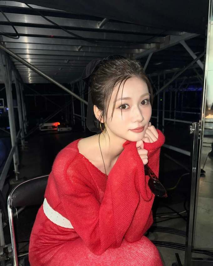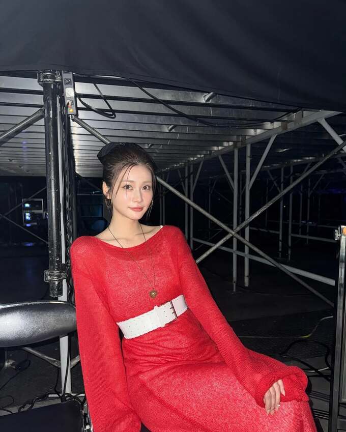 公開された写真では、赤いワンピースに白い幅広ベルトを合わせたスタイリングの舞台裏ショットが複数枚見られます。落ち着いた微笑みでカメラを見つめる生見さんの表情が印象的です。赤いワンピースとは対照的に、黒いサングラスを手に持ち、アクセントとして金色のフープピアスを着用しています。