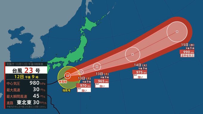 気象庁によりますと、台風第23号は、きょう(12日)午後9時には潮岬(和歌山)の南南東約220キロにあって、1時間におよそ30キロの速さで東北東へ進んでいます。