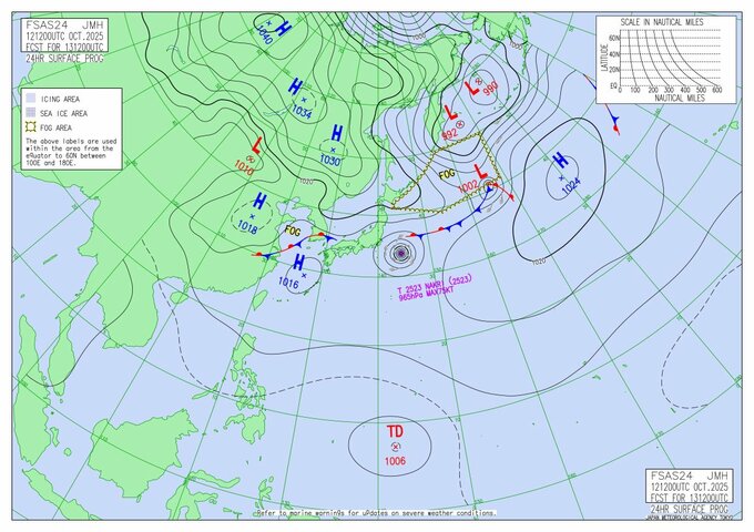 13日(月祝)夜の予想天気図に「熱帯低気圧=台風のたまご」を表す「TD」マークが現れました。「TD」とは「TROPICAL DEPRESSION」の略で、日本語では「熱帯低気圧(最大風速34ノット未満)」の意味です、最大風速34ノットは、台風情報でよく耳にする最大風速17.2mのことで、この最大風速が17.2m以上になれば「台風」になります。