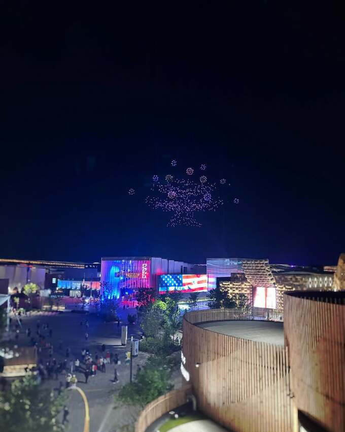 3か月後、皆藤さんは親友と共に2度目の万博訪問。この時は「混んでいたけどそれもまたとっても楽しかった」と綴っています。夜のドローンショーの様子も投稿され、「ドローンショー良かったなぁ」と綴り、色とりどりの光を放つドローンが夜空を彩る光景が写されています。
