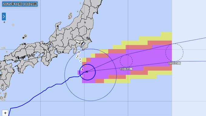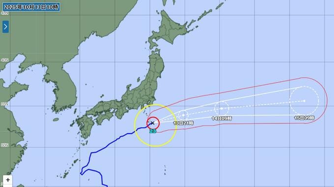強い台風23号は13日午前、伊豆諸島の東を東北東へ進んでいます。台風はこのあと伊豆諸島から次第に遠ざかる見込みですが、伊豆諸島では非常に強い風や猛烈な風が吹き、大しけとなっている所があります。今後は日本の東へ進み、14日には温帯低気圧に変わる見込みです。