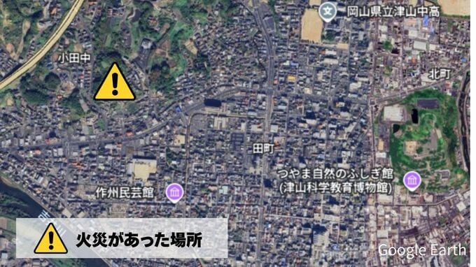 きょう(13日)午前11時前、岡山県津山市小田中で「枯れ草が燃えている。車へ燃え移りそうだ」と消防に通報がありました(【画像①】に現場の地図)。