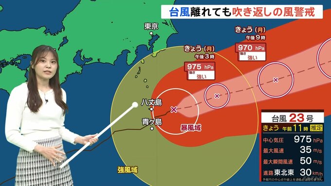 強い台風23号は現在、伊豆諸島・八丈島の東の海上を進んでいます。今後の台風の影響について、福山佳那気象予報士の解説です。強い台風23号は13日朝、八丈島に最も接近しました。このあと、次第に東へと離れる予想…