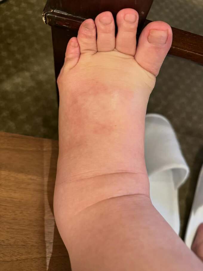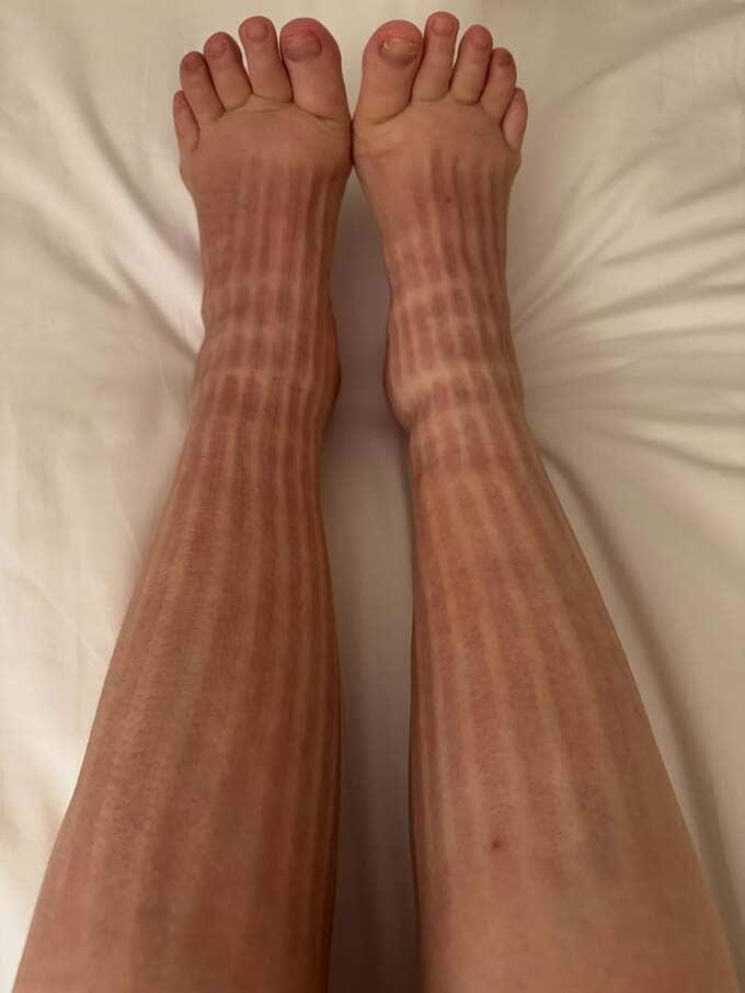 続けて「そしてむくみとのたたかい 着圧ソックス履く前と履いた後の違いがすごすぎる」と、足の画像をアップしています。