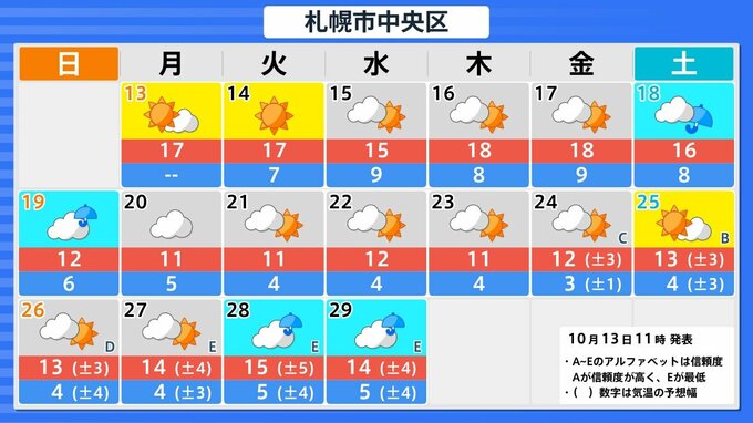 【台風情報】新たな「台風のたまご」熱帯低気圧がカロリン諸島で発生 今後台風に発達する?気象予報士が解説 各地の天気シミュレーション【気象庁発表 13日午後3時半更新】 RSK山陽放送 2025年10月13日(月) 15:32 国内 今後の全国各地への影響は? 【画像⑥~⑬】は、今後16日間の札幌・仙台・東京・名古屋・大阪・広島・福岡・那覇の天気予報です。 【画像⑥】 【画像⑦】 【画像⑧】 【画像⑨】 【画像⑩】 【画像⑪】 【画像⑫】 【画像⑬】 今後の情報に注意してください。