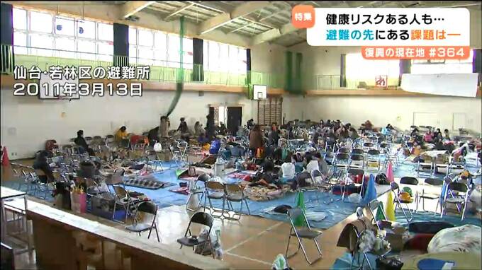 2011年3月11日、東日本大震災発生直後の仙台市内の避難所です。体育館の床にブルーシートを敷いただけで仕切りなどもありません。当時、避難所の劣悪な環境の中で体調を崩す人は少なくはなく、県内で災害関連死と認定された人は932人に上っています。