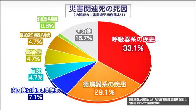 内閣府が、東日本大震災以降の大規模な災害を調査対象にまとめた災害関連死の事例集によりますと、関連死の死因のうち6割以上を呼吸器系または循環器系の疾患が占めています。
