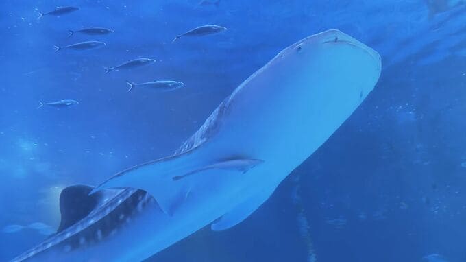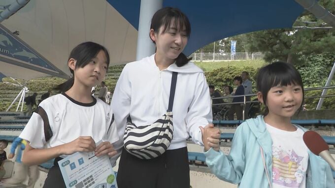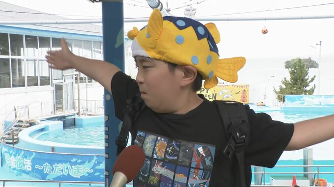 訪れた人「すごかった。ジャンプしたりするところ」「(Qなにが楽しかった?)ジンベエザメとイルカかな。あそこからここくらいまで大きかった」