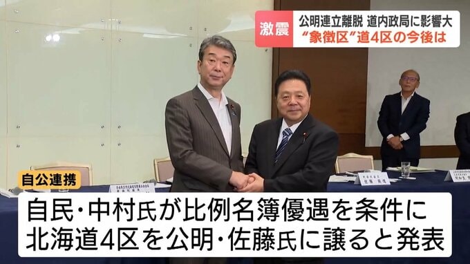 北海道内の自公連携を巡っては、9月9日、新たな「象徴区」として、自民・中村氏が、比例名簿で優遇されることを条件に、地盤である北海道4区を公明・佐藤氏に譲ると発表されたばかりでした。