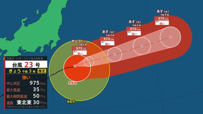 気象庁によりますと、強い台風第23号は、きょう(13日)午後3時には八丈島の東約260キロにあって、1時間におよそ35キロの速さで東北東へ進んでいます。