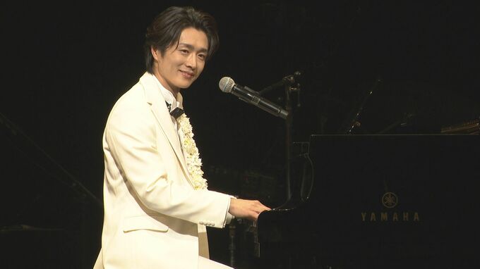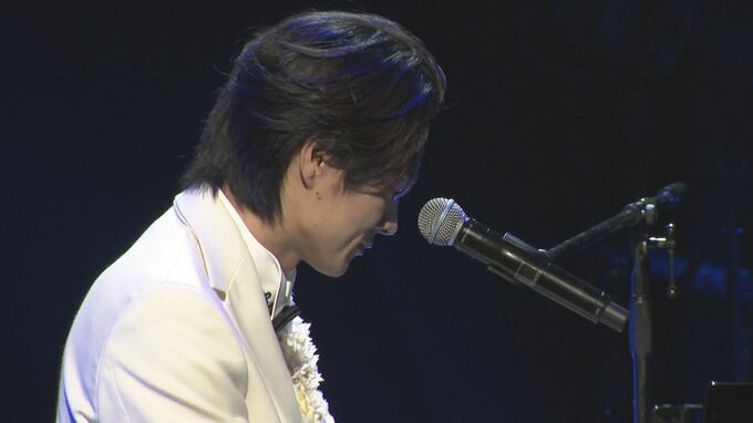 白いスーツ姿でにこやかに登場した真田さんは、報道陣に一礼すると、やや緊張した面持ちでグランドピアノの前に座りました。そして、尾崎豊さんの名曲『OH MY LITTLE GIRL』。