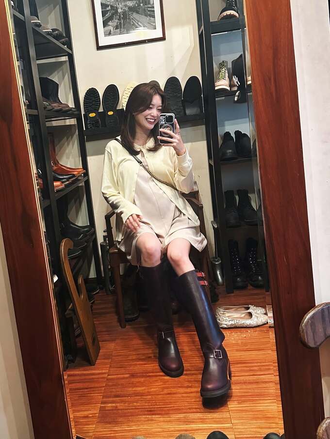 蜂谷さんは、「一年前にオーダーしていたブーツが出来上がった!」と投稿。ブーツを試着する様子の写真も公開しており、濃い茶色のレザー素材で、膝下まであるデザインが特徴的です。金具付きのストラップも施されています。