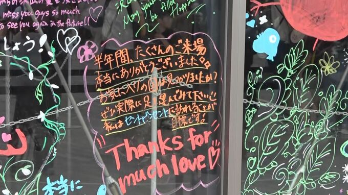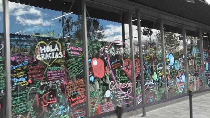 コモンズ館のガラスにメッセージ!閉幕に向けて値引きセールで半額も