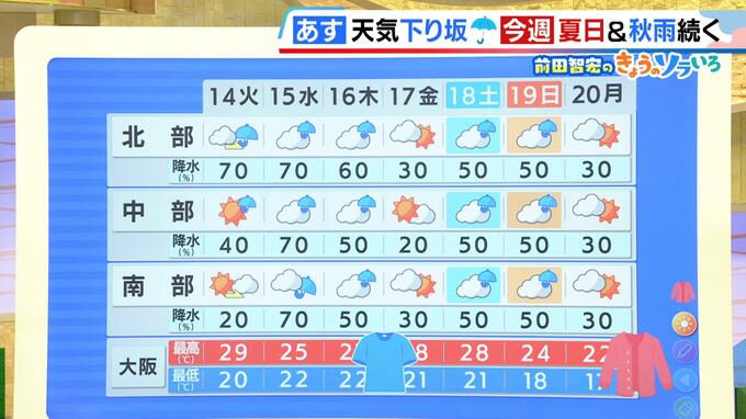 10月14日(火)の近畿地方は、天気が下り坂。今週は季節の境目の前線がウロウロして、雨の降る日が多くなりそうです。 近畿地方には、次第に秋雨前線がのびてくるでしょう。3連休明けの朝は晴れ間が出て、日…