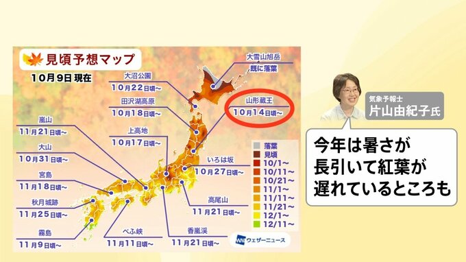 気象予報士の片山由紀子さんによりますと「今年は暑さが長引いて紅葉が遅れているところもある」ということです。