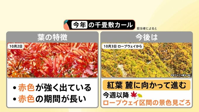 ロープウェイを運営してる会社の担当者によると「2025年の千畳敷カール」は、▼赤色が強く出ている、▼赤色の期間が長いとのこと。