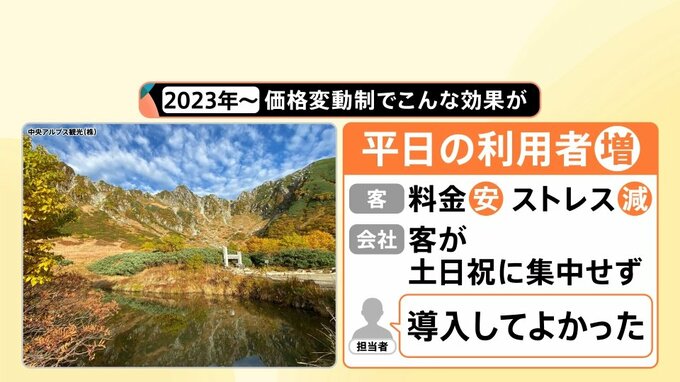 会社にとっては、客が土日祝日に集中せず、安全にロープウェイを運行できるメリットがあるため、「導入してよかった」という声も聞こえています。