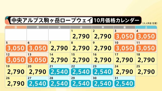 「中央アルプス駒ヶ岳ロープウェイ 10月価格カレンダー(大人料金 往復)」を見ますと、3連休などは3050円と10月の価格では一番高くなります。一方で、平日は2790円と少し安くなり、さらに、紅葉の見頃が麓に移ってきた頃は2540円と、最大で500円程度安くなります。