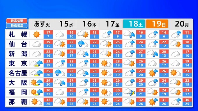 今週も低気圧や前線が通過する影響で、すっきりしない空模様が続きそうです。金曜日は晴れ間も見えて、いったんお天気が回復しそうですが、土曜日は再び広く雨となりそうです。この冷たい雨を境に、季節が前へ進み、那覇を除く西日本でも真夏日がなくなってきそうです。東京でも最高気温が20℃以下の日が増えてくるでしょう。