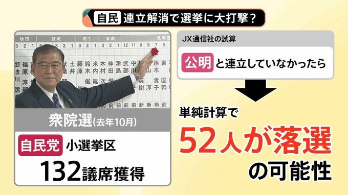 「公明党と連立していなかったら」JX通信社が試算したところ、単純計算で52人が落選している可能性があるとのことです。