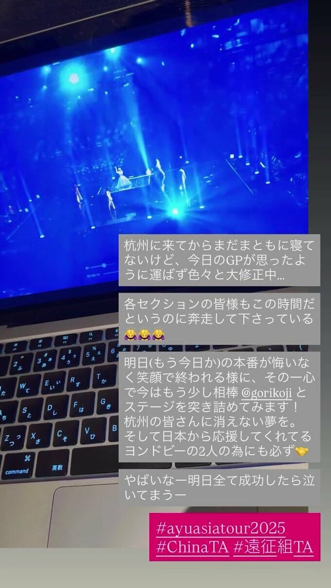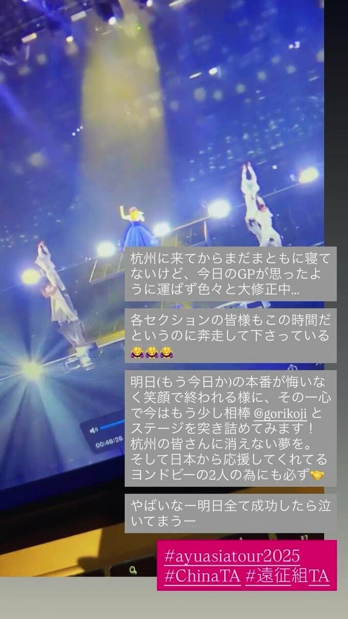 浜崎さんは現在、アジアツアー『ayumi hamasaki ASIA TOUR 2025』の真っ最中で、投稿は中国・杭州での公演前夜に行われたものとみられます。