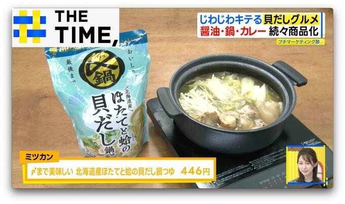ほかにもポン酢や味噌などにも貝だしを使った商品が出ていますが、これからの季節にぴったりなのが、年間販売数約5500万個の鍋つゆシリーズから発売された「〆まで美味しい 北海道産ほたてと蛤の貝だし鍋つゆ」(ミツカン/750g・446円)。