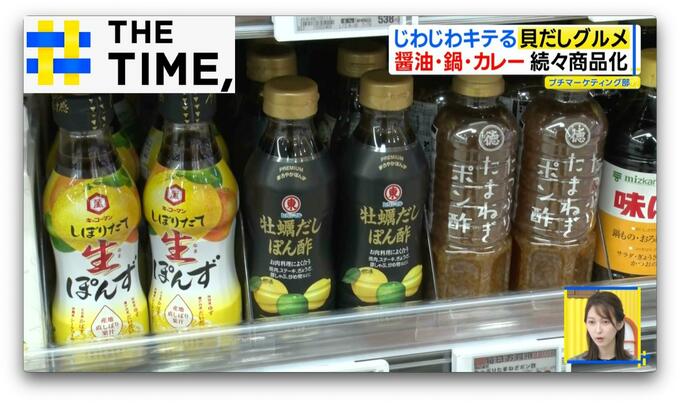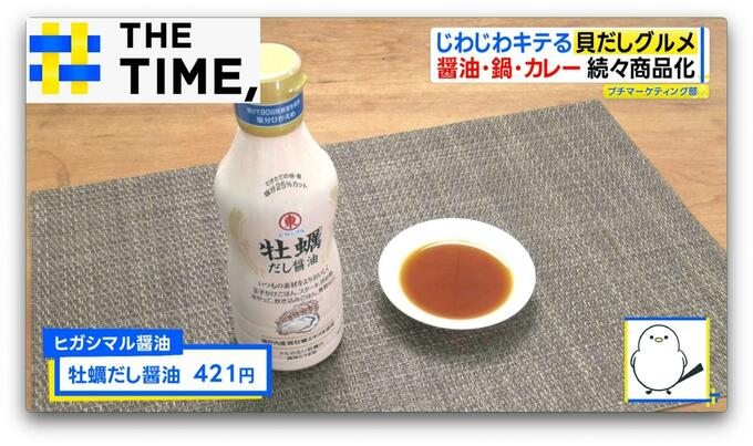 さらに加工技術などの進化で、【さまざま商品を展開できるようになった】とのことで、例えば老舗メーカーのヒガシマル醤油からは、「牡蠣だし醤油」(400ml・412円)。