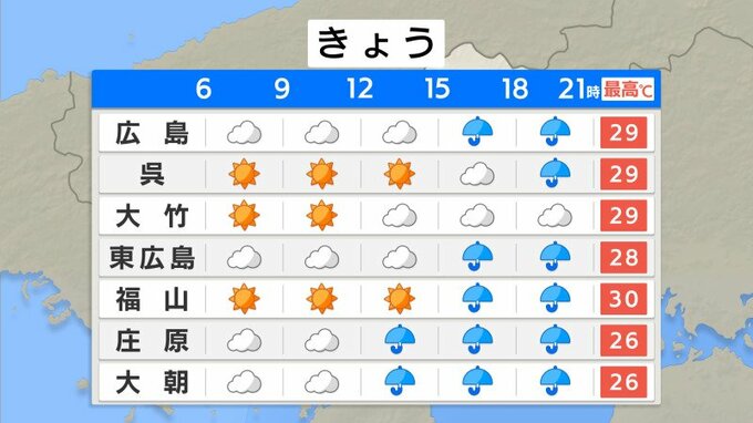 けさ(14日朝)の広島県内は、雲が低く垂れ込めています。最低気温は、広島市中区21.4℃・福山市18.9℃・庄原市17.1℃と、冷え込みは弱くなっています。