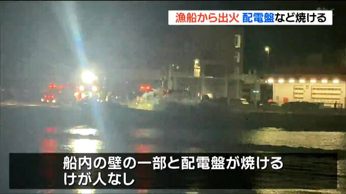 消防がポンプ車など7台を出し、火は約1時間20分後に消し止められましたが、船内の壁の一部と配電盤が焼けました。けがをした人はいませんでした。