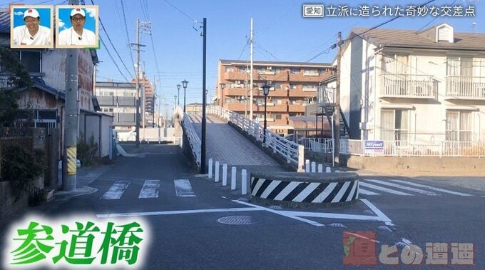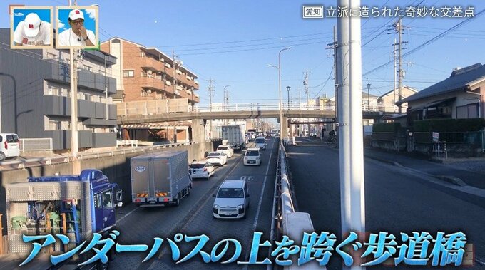 愛知県稲沢市にある名鉄・国府宮駅の南には、道路の中央に立派なアーチ状の歩行者専用道路があり、車道はその歩道を挟んで二手に分かれる奇妙な交差点があります。