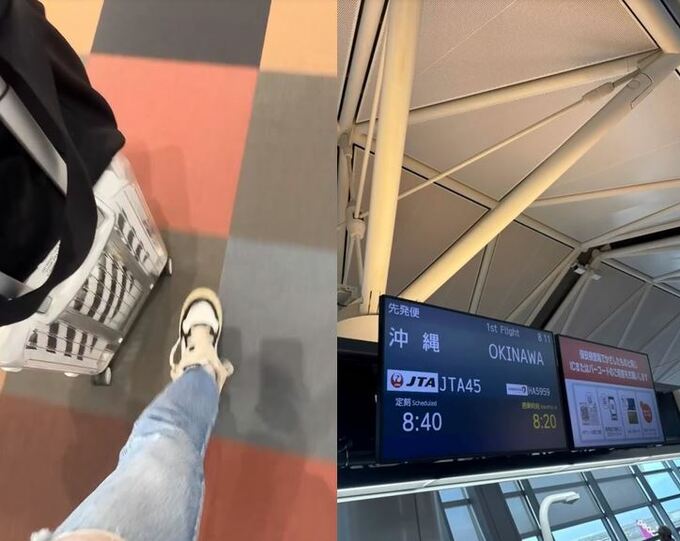 梅宮さんは、「うん。。。」と夫の提案を受け入れたことを明かし、「準備ゼロ、予約ゼロ笑 と言う事で、沖縄セットは持ってきてもらって まさかの "よもやの沖縄合流"」と綴りました。投稿された動画には、1人で空港へ向かい、名古屋発午前8時40分の飛行機で沖縄へ向かう様子が収められています。