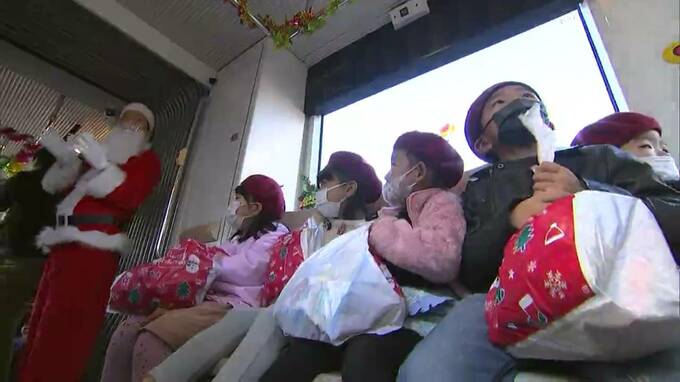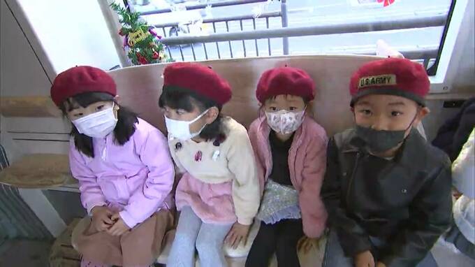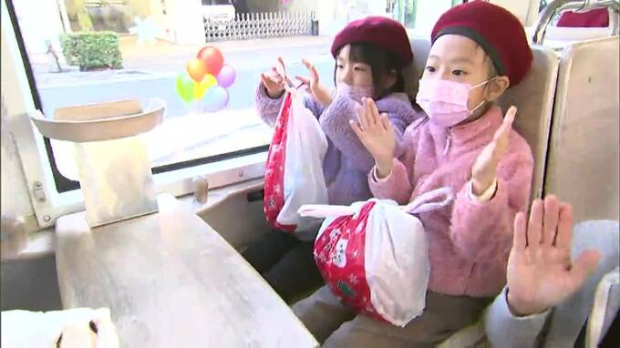 岡山城のリニューアルに合わせてラッピングされた黒と金の車両でのクリスマス電車は今年が最後で、山陽学園短期大学附属幼稚園の園児36人が招かれ、サンタクロースからお菓子のプレゼントが贈られました。