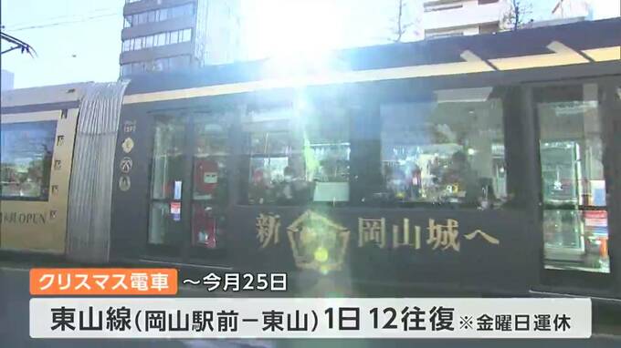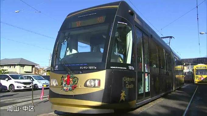 岡山市中心部を走る路面電車に、この時期恒例の「クリスマス電車」がお目見えし、運行が始まりました。