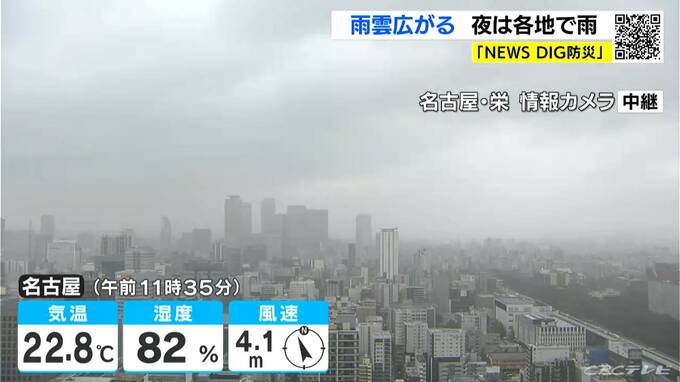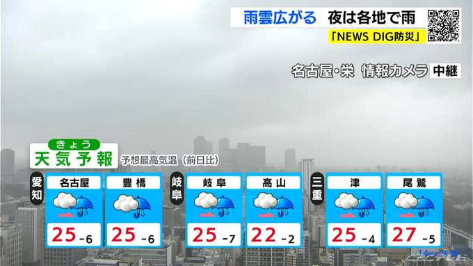 きょうの午後は天気が下り坂で、夜は広く雨が降るでしょう。予想最高気温は名古屋や岐阜、津などで25℃と、日中も過ごしやすい気温になりそうです。