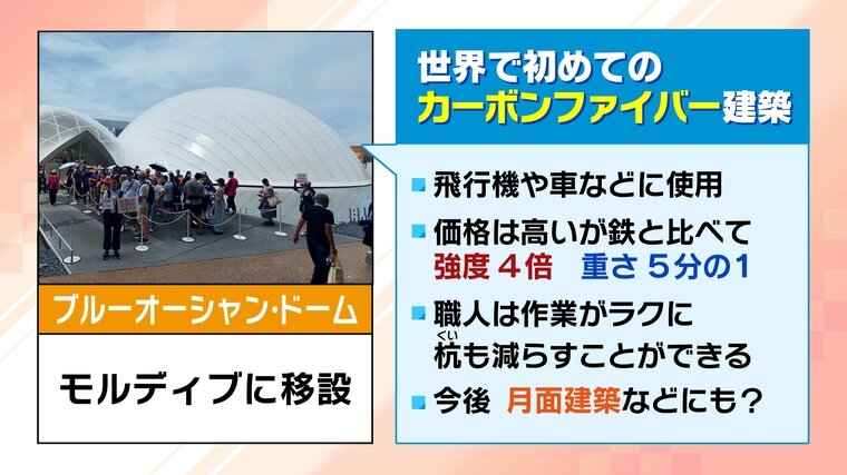 価格は高いですが、鉄と比べて強度は4倍でも重さは5分の1。そのため職人は作業が楽になり、使用する杭も減らすこともできるということです。今後、軽量化が求められる月面建築などの分野でも活用されていくといわれている技術が、万博で試されたといえます。
