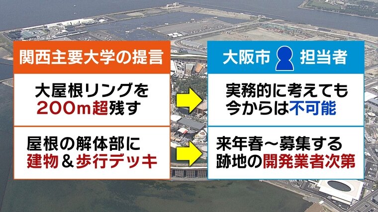 そうした中、関西主要大学のトップらは、▽200mよりももっと多く残せないか、▽解体部分に建物をつくり、その中に歩行デッキを確保し1周回遊を可能に、▽入場料で財源確保も、という提言を行いました。