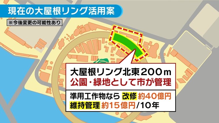 現時点では、北東約200mを大阪市が公園・緑地として管理していく方針です。準用工作物、いわゆる展望台として使う場合は、改修費は約40億円で維持管理費は10年で約15億円かかるということです。