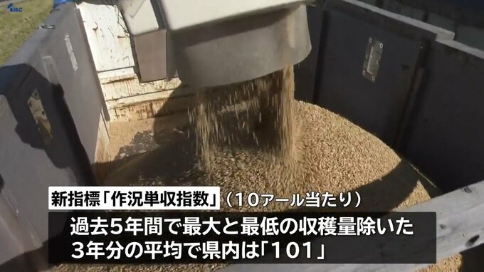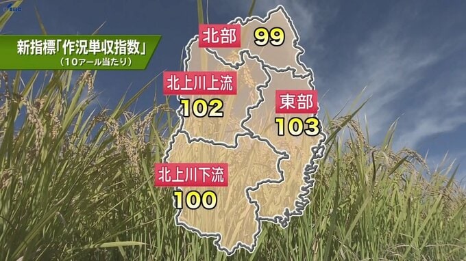 また、10アール当たりの収穫量の指標として、新たに導入された「作況単収指数」も初めて公表され、過去5年間の数値から最大と最低のものを除いた3年分の平均で、県内は101となっています。