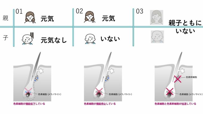 伊藤研究員によると、白髪になるパターンは3つあるといいます。わかりやすく「色素幹細胞」を親、「色素細胞」を子どもに例えてみます。