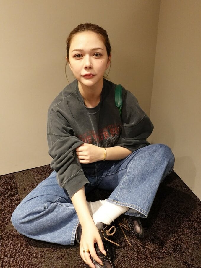 投稿には、事務所内での様子を捉えた複数の写真が添えられています。写真からは、村重さんがベージュの壁と茶色い床のある室内で、焦げ茶色のスニーカーを履いている様子が確認できます。彼女は赤い文字がプリントされたトレーナーにデニムパンツを合わせ、白いソックスとスニーカーというカジュアルなスタイルで登場しています。