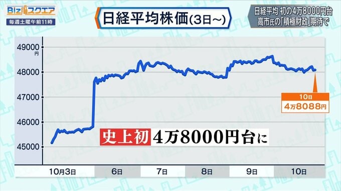 「積極的な財政政策」への期待から、日経平均株価は6日の取引時間中に史上初めて4万8000円台を突破。10日の終値も4万8080円と高値を維持している。