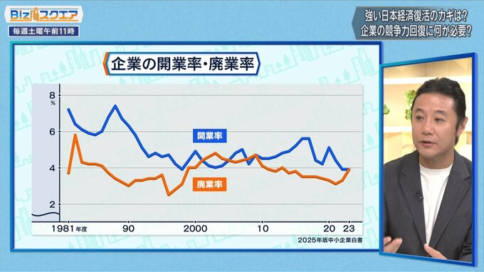 「開業率を上げるには、時代に合わなくなってきたビジネスを廃業することが大事だが、日本は長い間生産性が低い企業が市場に放置されている。経営者からは、『そんな冷徹なことを…』という意見はあると思うが、ある程度【健全な競争】は必要。そういう意味では廃業率がかなり低いところでとどまってるのは大きな問題」