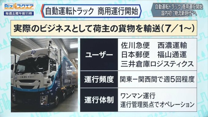 7月に国内初となる「自動運転トラックの商用運行」を開始し、関東-関西間の幹線道路で「ワンマン運行」で荷物を輸送。