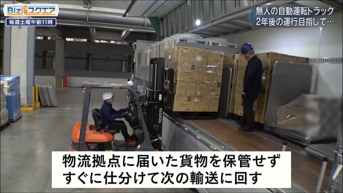 またこの実証実験では、物流拠点に届いた貨物を保管せず、すぐに仕分けて次の輸送に回すことを行っている。これは、自動運転トラックの稼働率と積載率を最大限に高める狙いだ。