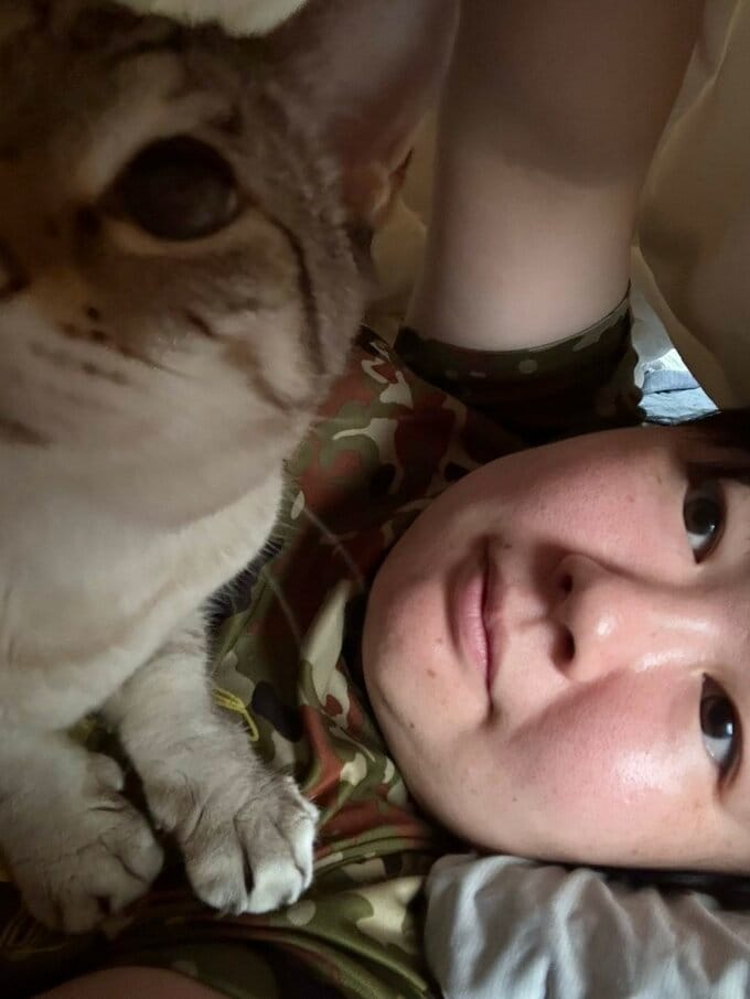 やす子さんは「#猫のいる生活」とだけテキスト。1枚目に、寝そべったやす子さんの胸の上に前足をついてスマホのレンズにぶつかるほどに上体を伸ばして顔を寄せているアビシとの2ショットを投稿しています。