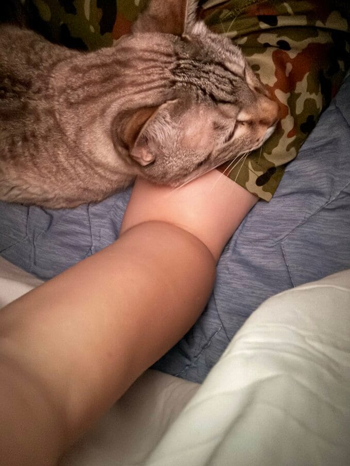 2枚目には、やす子さんの迷彩Tシャツの左上腕を腕枕にして、下あごを乗せてのんびりしているアビシの姿を投稿。