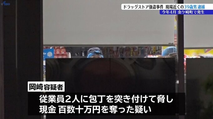 警察によりますと、岡崎容疑者は4月27日の午後10時ごろ、金ケ崎町西根にある閉店作業中のドラッグストアに侵入し、女性店長と男性従業員の2人に包丁を突き付けて脅し、現金百数十万円を奪った疑いが持たれています。