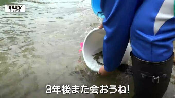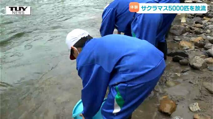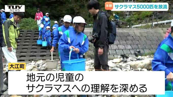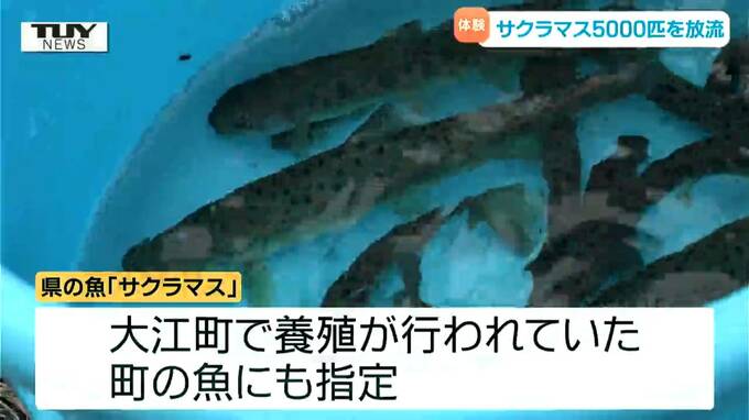 数年後の再会を願って、きょう、山形県大江町の小学生が県の魚「サクラマス」の幼魚を放流しました。