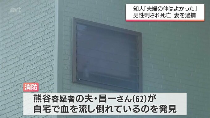 警察や消防によりますと、13日午後8時8分ごろ、「家族が胸から出血している」と119番通報があり、駆け付けた消防が、熊谷容疑者の夫の昌一さん62歳が自宅で血を流して倒れているのを発見しました。